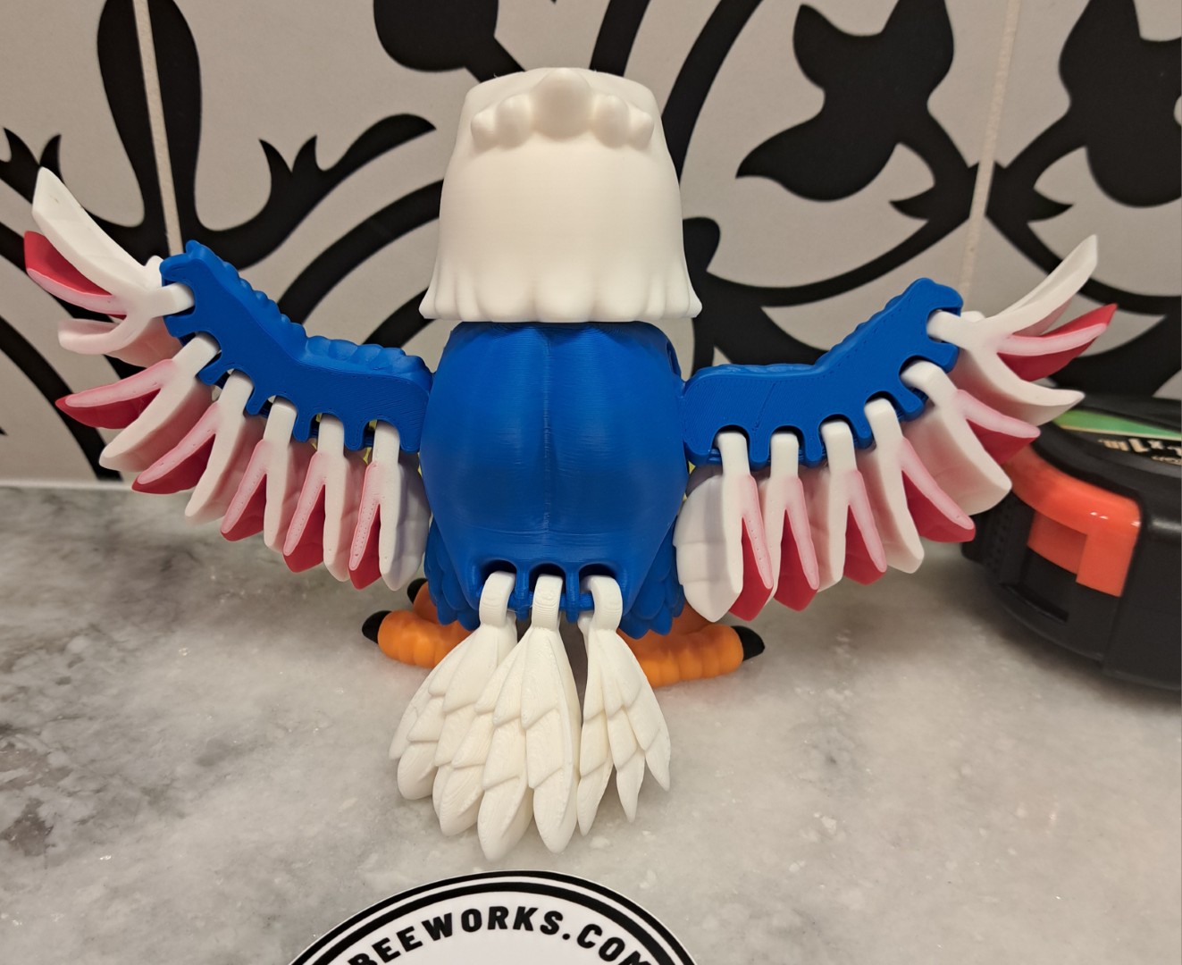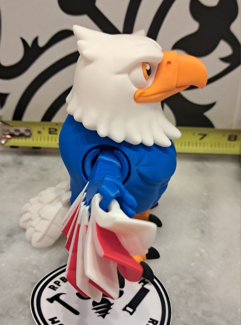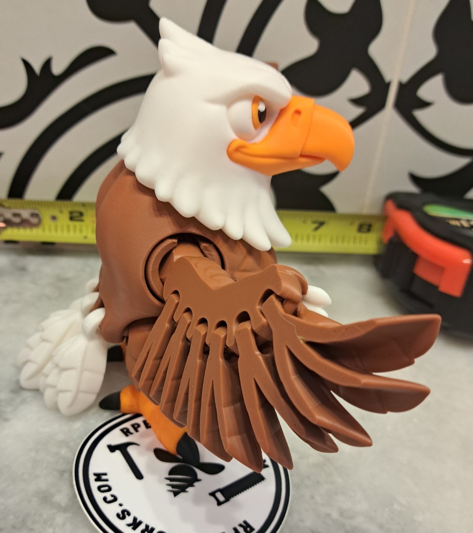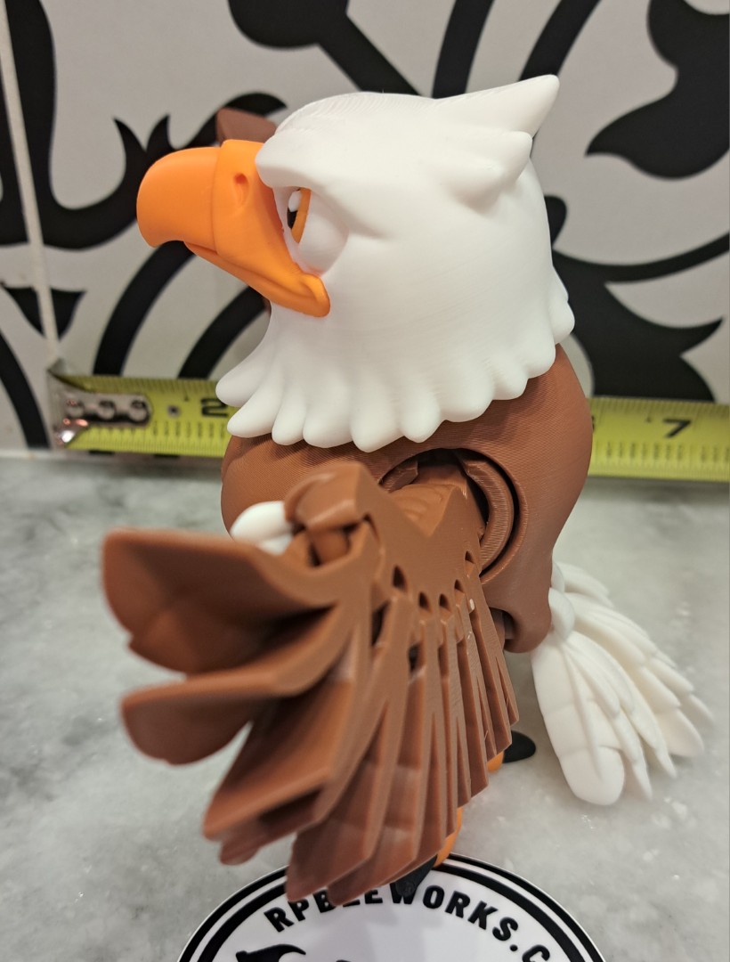 This eagle is very cool. It proudly stands with his wings spread out. This is an articulating toy so the head turns, the wings move, along with the trail feathers and feet. However, it will still stand up!