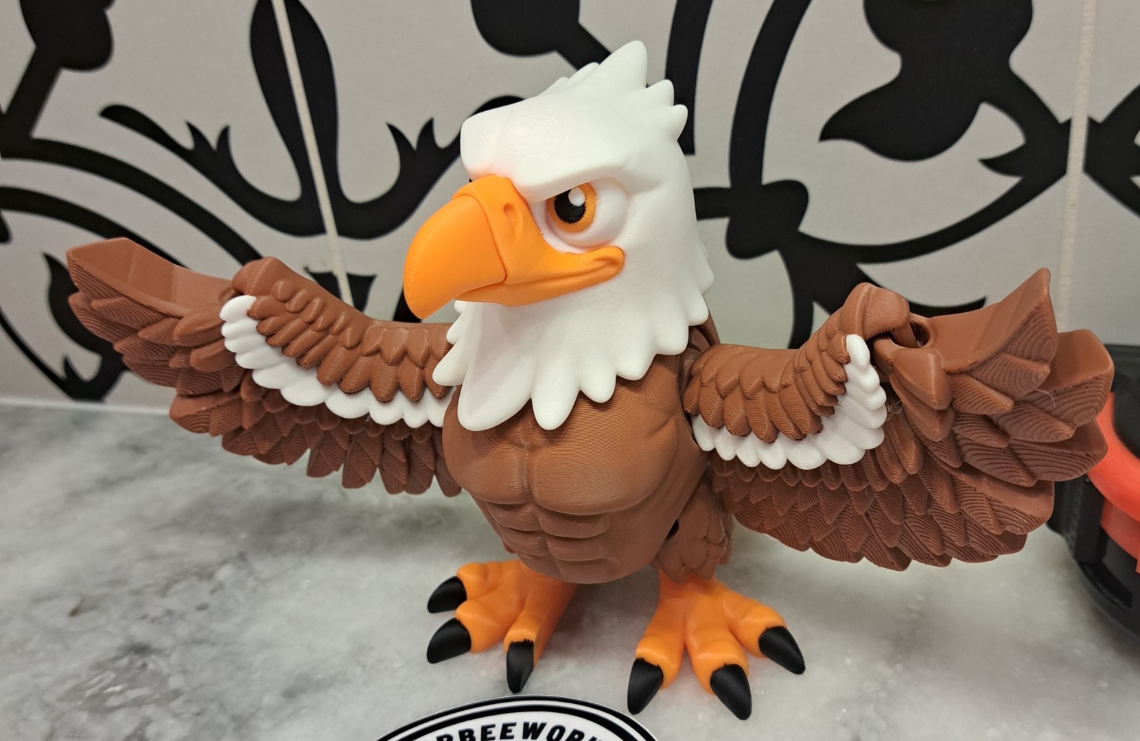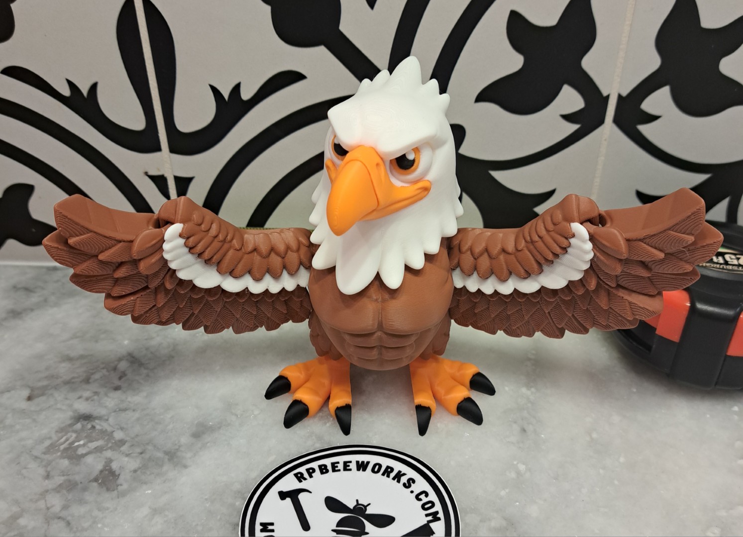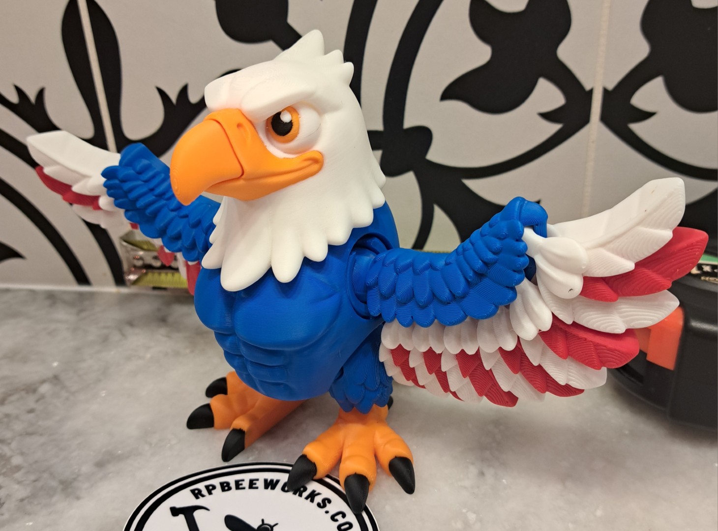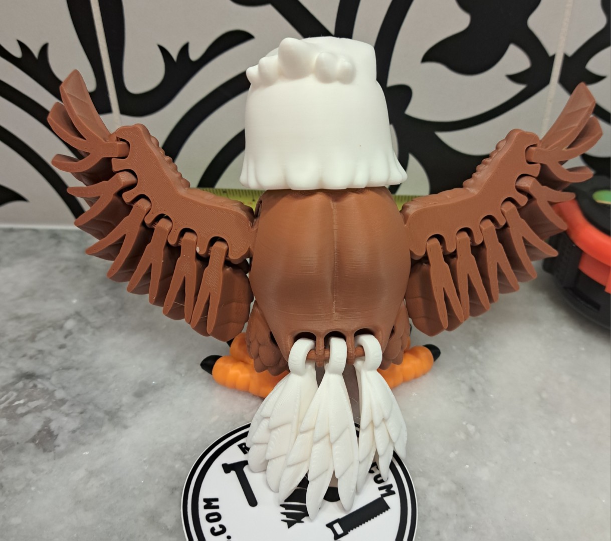 This eagle is very cool. It proudly stands with his wings spread out. This is an articulating toy so the head turns, the wings move, along with the trail feathers and feet. However, it will still stand up!