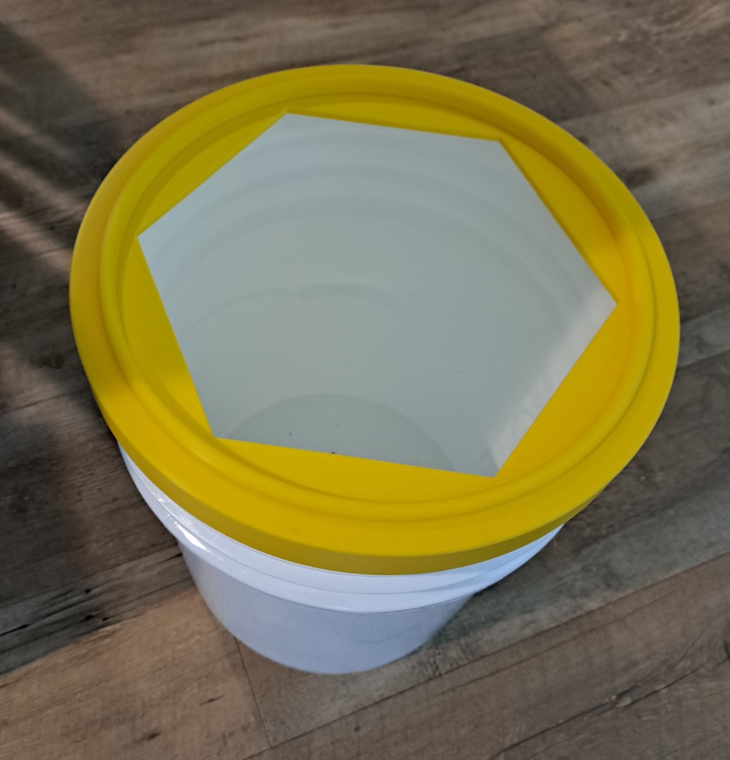 This device goes by many names but it makes it possible to stack two buckets on top of each other while removing wax cappings or crush and strain. Many beekeepers cannot afford a nice large wax cappings table so they cut their wax cappings over a bucket. They might use a 5 gallon paint strainer which will catch the wax and the honey will drain down to the bottom. The problem with this is that the honey fills up quickly. So if your top bucket has holes in it, the honey can drain into the bottom bucket. This “Crush and Strain Lid” holds up the top bucket so the honey drains into the bottom bucket.
