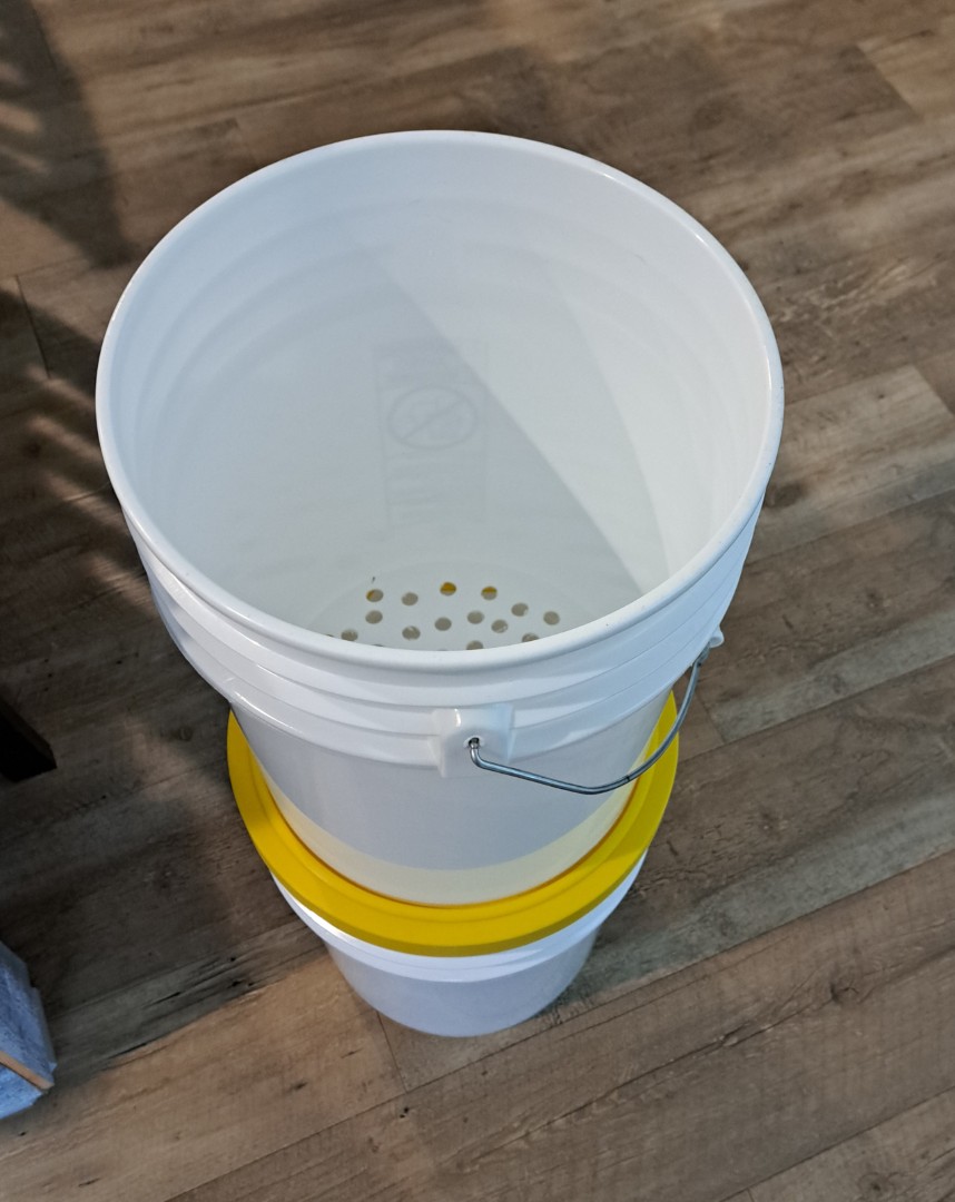 Set up – Take a normal bucket and place on the bottom. Add the “Bucket Holder” to the bucket and it will not slide off. The top bucket should have holes in the bottom and it will sit on the “Bucket Holder”. It has grooves to keep the bucket from sliding off as well. Then on the top bucket and a paint strainer to the bucket. Then add a frame buddy (frame holder) and pulling wax cappings!